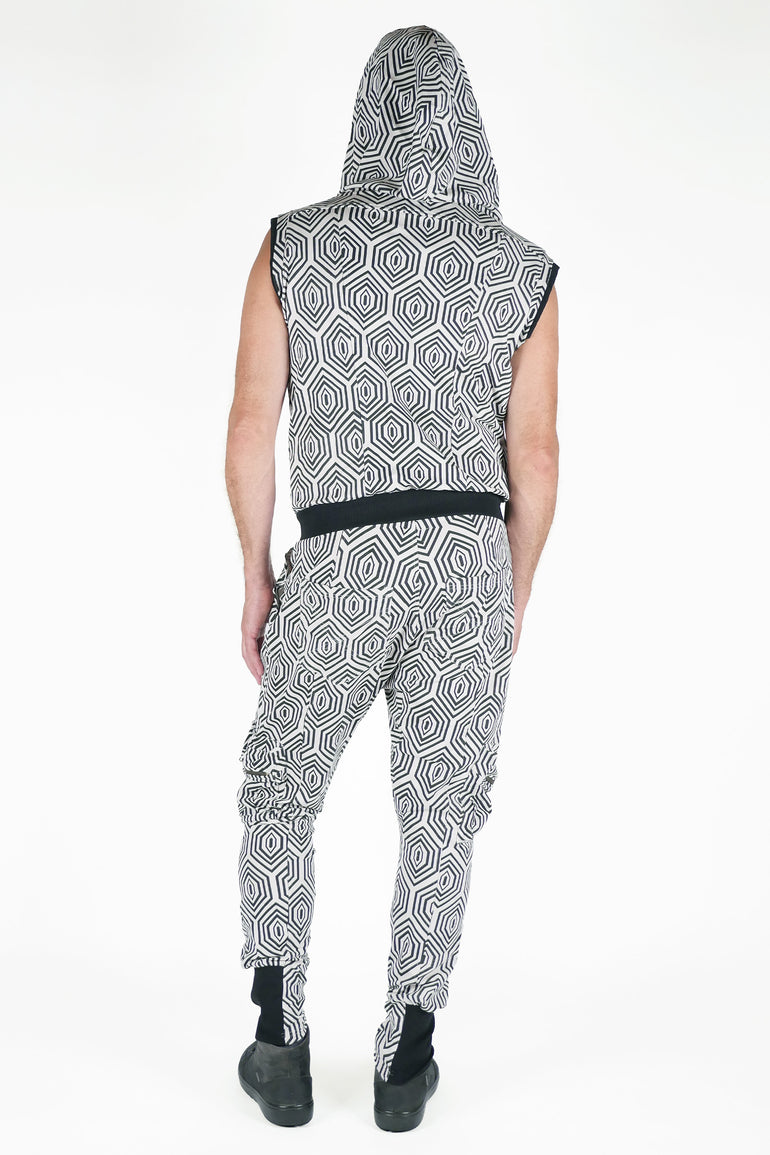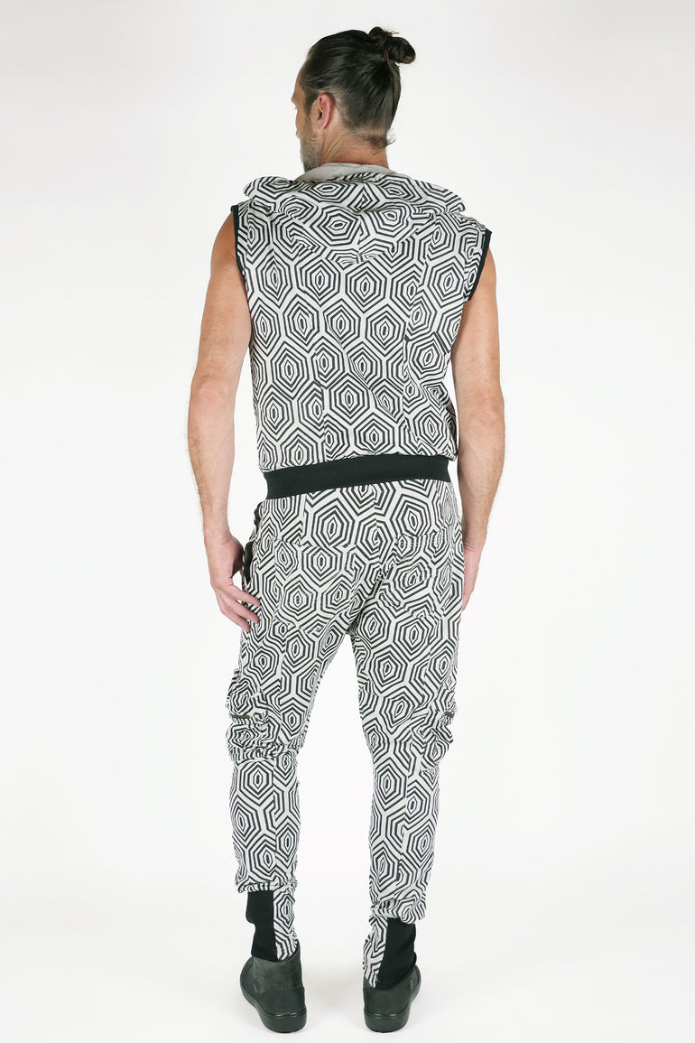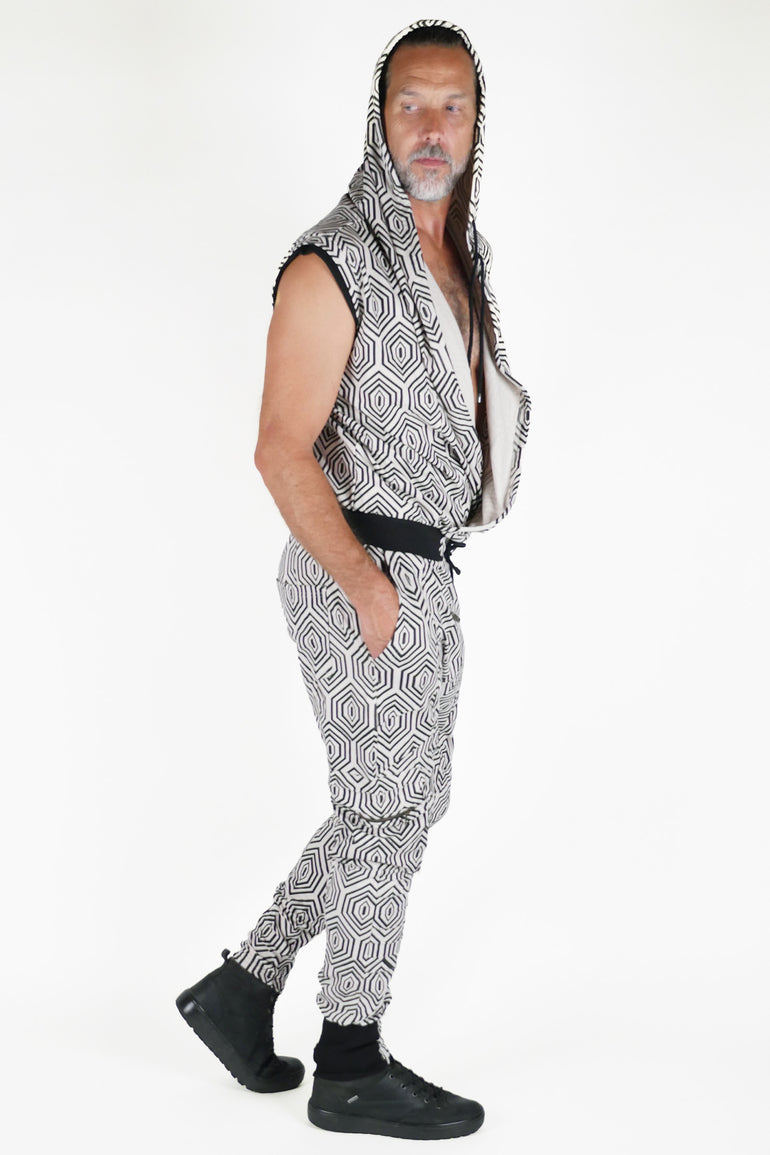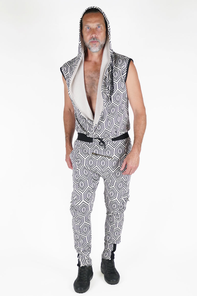 The Solar Onesie is the masterpiece of our celebrated Solar design conception. The best of both worlds, an ultra-comfortable drop crotch lower pant with spacious front and rear pockets plus two zippered side leg cargo pockets, all this combined with a very sexy open lapel hooded top that can be adjusted via draw string for multiple configurations. The White Diamond Solar Onesie gives you the freedom to move whether grooving at your favorite venue or just showing off your inner Ninja. This one of a kind Jumpsuit is made from high quality medium weight organic cotton (94%) and Spandex (6%) making it very popular with our fire spinning friends! This quality piece has a great feel and texture a true pleasure to wear! This is the perfect piece for the Playa, Festival or Street.