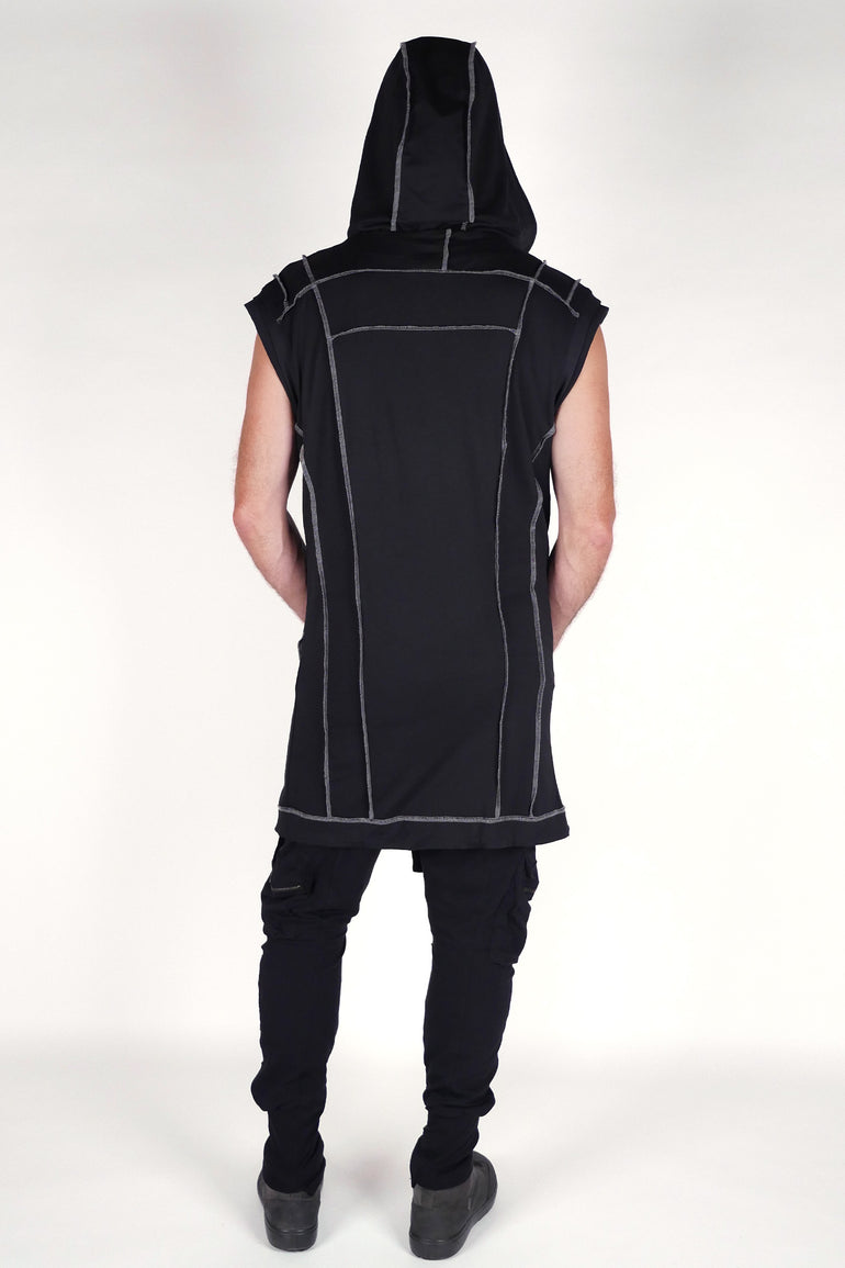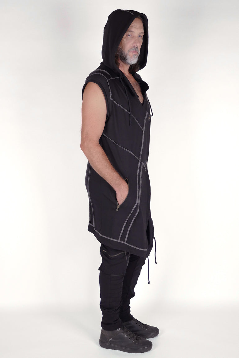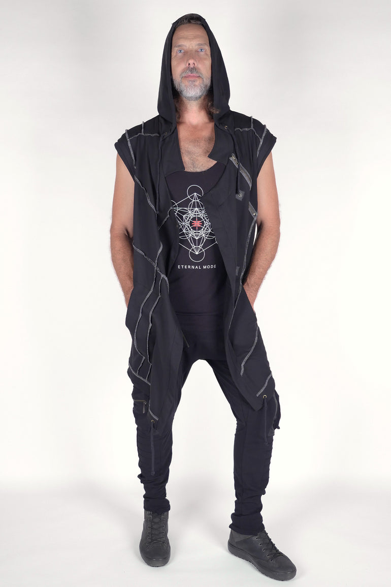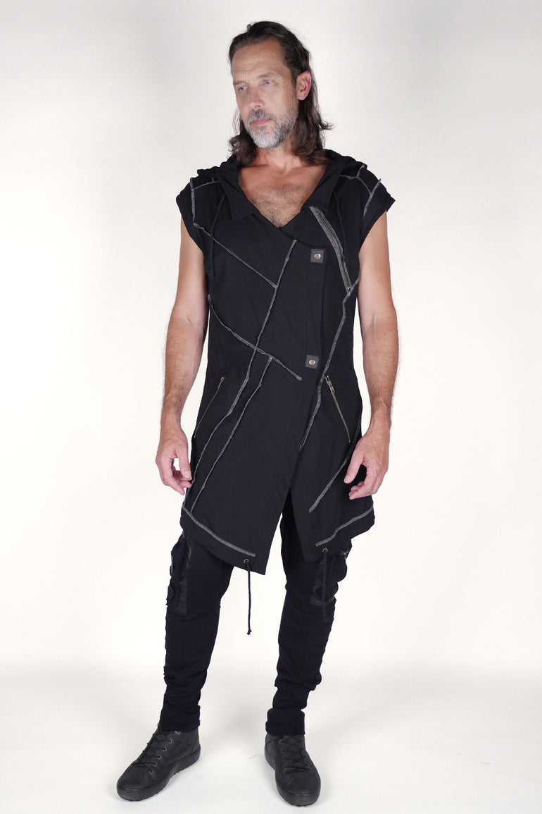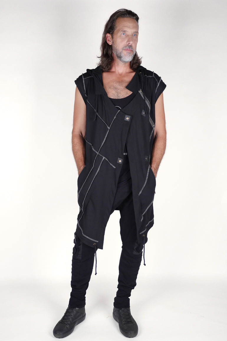 The Pollux Vest is an intricate one of a kind hand sewn masterpiece.  This coat is a wearing pleasure which gives you a  Post Apocalyptic look only our Pollux Collection can deliver. The Limited is made from medium weight organic cotton making it a warm outer layer yet breathable and ultra comfortable.  We added in extra details like a zippered breast pocket and lined and cuffed hood.   Sewn with an A Symmetrical thread stitch giving the wearer a very distinctive one of a kind look.